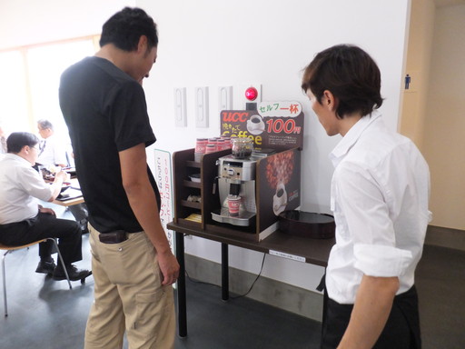 食後にコーヒーはいかがですか?セルフとなりますが、UCC挽きたてコーヒーが一杯100円です。このコーヒーマシンのまわりの棚とPOPは当社が制作したディスプレイ什器です。ぜひご来店のときはこちらも見て下さい。もし、販促ツールにご興味のある方は、お気軽に当社にご連絡ください。→