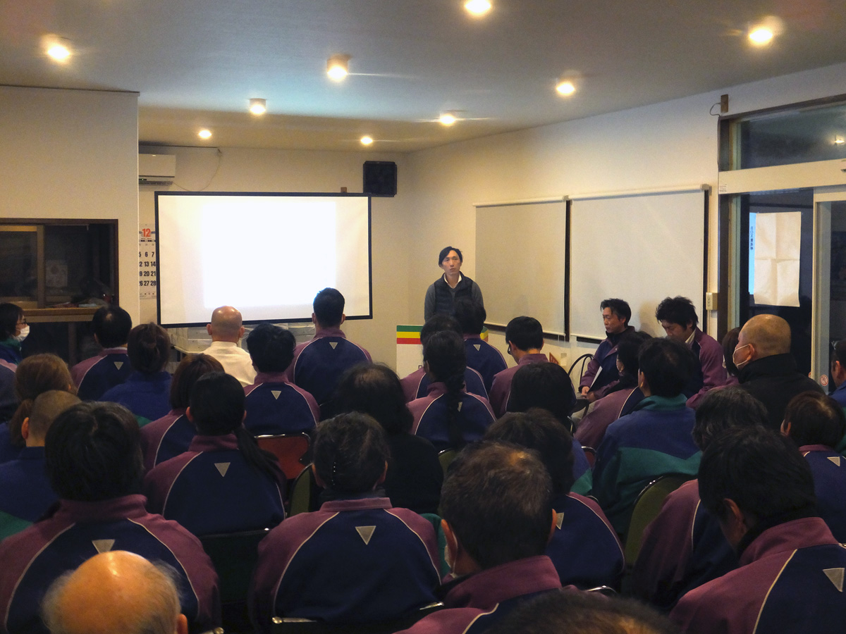 工場長の説明に耳を向けています。